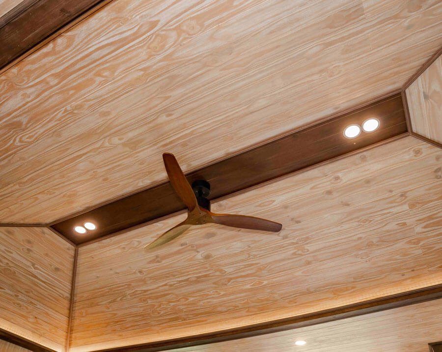 Hệ thống cảm biến trang bị tại các khu vực cửa ra vào hoặc cần chiếu sáng tự động; toàn bộ ngôi nhà gỗ được lắp đặt bộ công tắc Athena giúp việc điều khiển tiện lợi hơn…